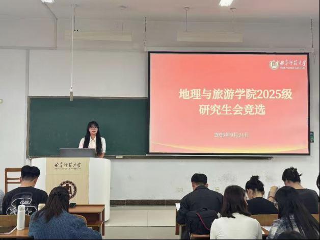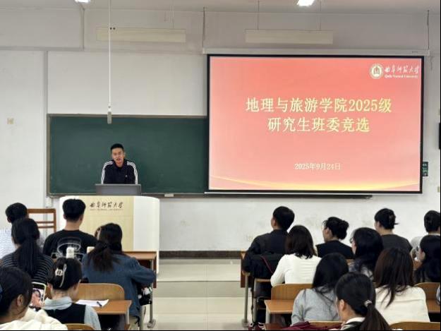 新起点呼唤新担当,新集体孕育新力量,为深化班级凝聚力建设和构建高效的学生管理体系。9月24日下午,地理与旅游学院于S413教室举行2025级研究生会纳新暨班委竞选大会。地理与旅游学院研究生辅导员赵岩、2025届和2026届研究生会主席团出席会议并担任评委。会议由研究生会主席杭庆厚主持,2025级全体研究生参加。
