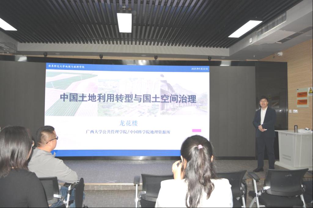 为庆祝曲阜师范大学建校70周年暨地理与旅游学院建院40周年,2025年9月22日,英国社会科学院院士(人文地理学)、广西大学教育部长江学者特聘教授、中国科学院地理科学与资源研究所区域农业与农村发展研究中心副主任龙花楼教授做客“经纬讲堂·高端论坛”,为学院师生作《中国土地利用转型与国土空间治理》主题学术报告。报告会由地理与旅游学院副院长于伟主持,学院部分教师及研究生参加报告会。