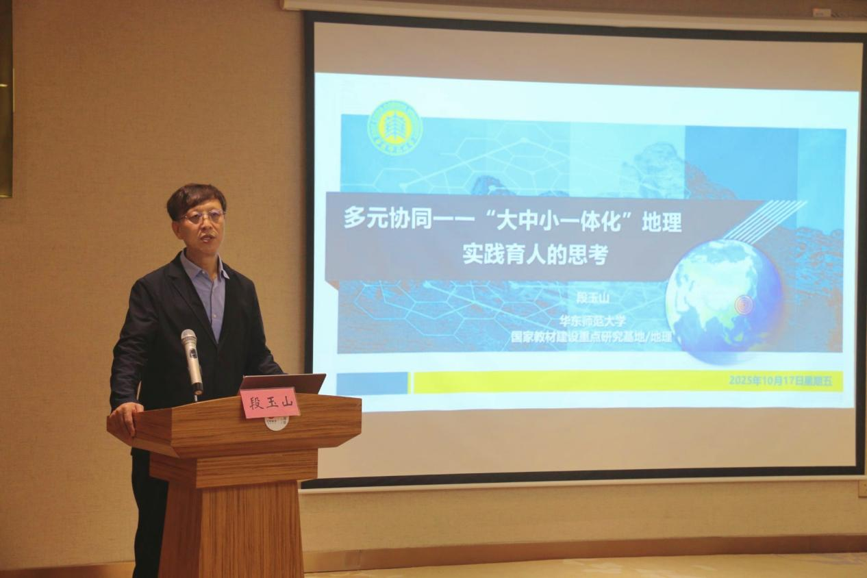 为庆祝曲阜师范大学建校70周年暨地理与旅游学院建院40周年,2025年10月17日,我国地理教育领域的权威专家、中小学地理国家教材建设重点研究基地主任、中国教育学会地理教学专业委员会理事长、《地理教学》杂志主编、华东师范大学地理科学学院段玉山教授做客“经纬讲堂·高端论坛”,为学院师生作了题为《多元协同——“大中小一体化”地理实践育人的思考》的精彩学术报告。报告会由地理与旅游学院副院长吴军主持。山东省高中地理教研员舒德全、山东教育出版社于增强主任,以及来自省内济南、青岛、烟台、威海、东营、德州、滨州、日照、枣庄等地市的十余个中学的校领导和教师代表,我院部分教师及研究生参加了报告会。