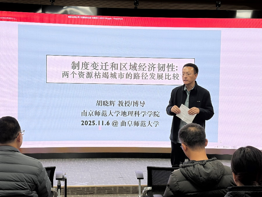 为庆祝曲阜师范大学建校70周年暨地理与旅游学院建院40周年,11月6日下午,地理与旅游学院特邀南京师范大学校中青年领军人才、博士生导师胡晓辉教授做客“经纬讲堂·高端讲坛”,为学院师生作了题为《制度变迁与区域经济韧性:两个资源枯竭城市的路径发展比较》的学术报告。学院相关专业教师及研究生参加了此次报告会。